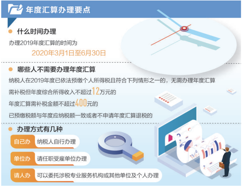 据税务部门有关负责人介绍,年度汇算,通俗来说,就是居民个人将一个纳税年度内取得的综合所得合并后按年计算全年最终应纳的个人所得税,再减除纳税年度已预缴的税款后,计算应退或者应补税额,向税务机关办理申报并进行税款结算的行为。同时,对综合所得年收入合计不超过12万元以及应补缴税额不超过400元的纳税人,无须办理年度汇算也无须补税,给予纳税人充分的税收优惠。